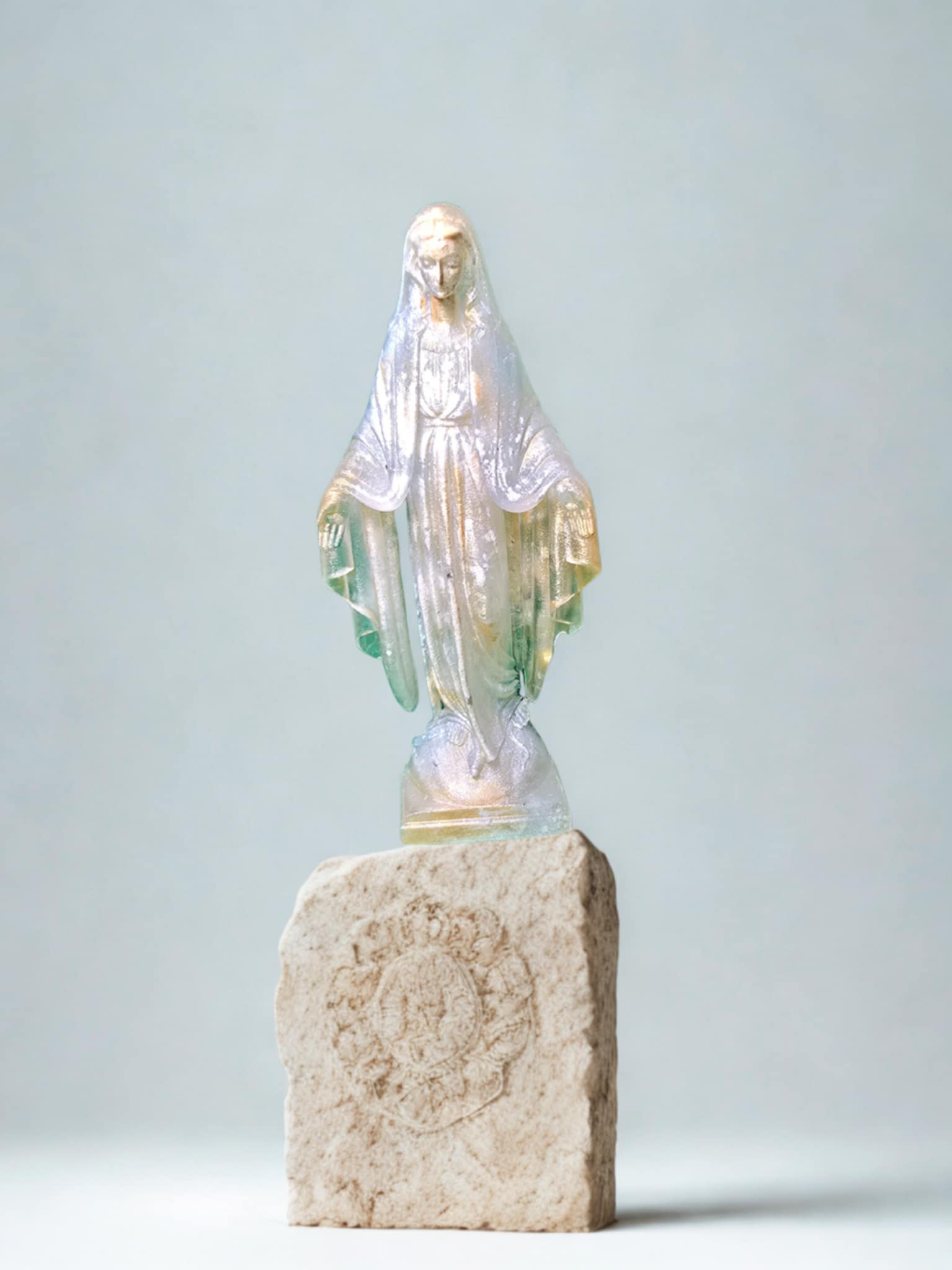 Sculptée en résine de haute qualité, cette œuvre se distingue par un effet irisé et des dégradés délicats de vert et d’or, évoquant pureté et lumière. La base en pierre naturelle apporte stabilité et authenticité, soulignant le contraste entre modernité et tradition. Chaque pièce est coulée, polie et finie à la main, rendant chaque exemplaire véritablement unique.